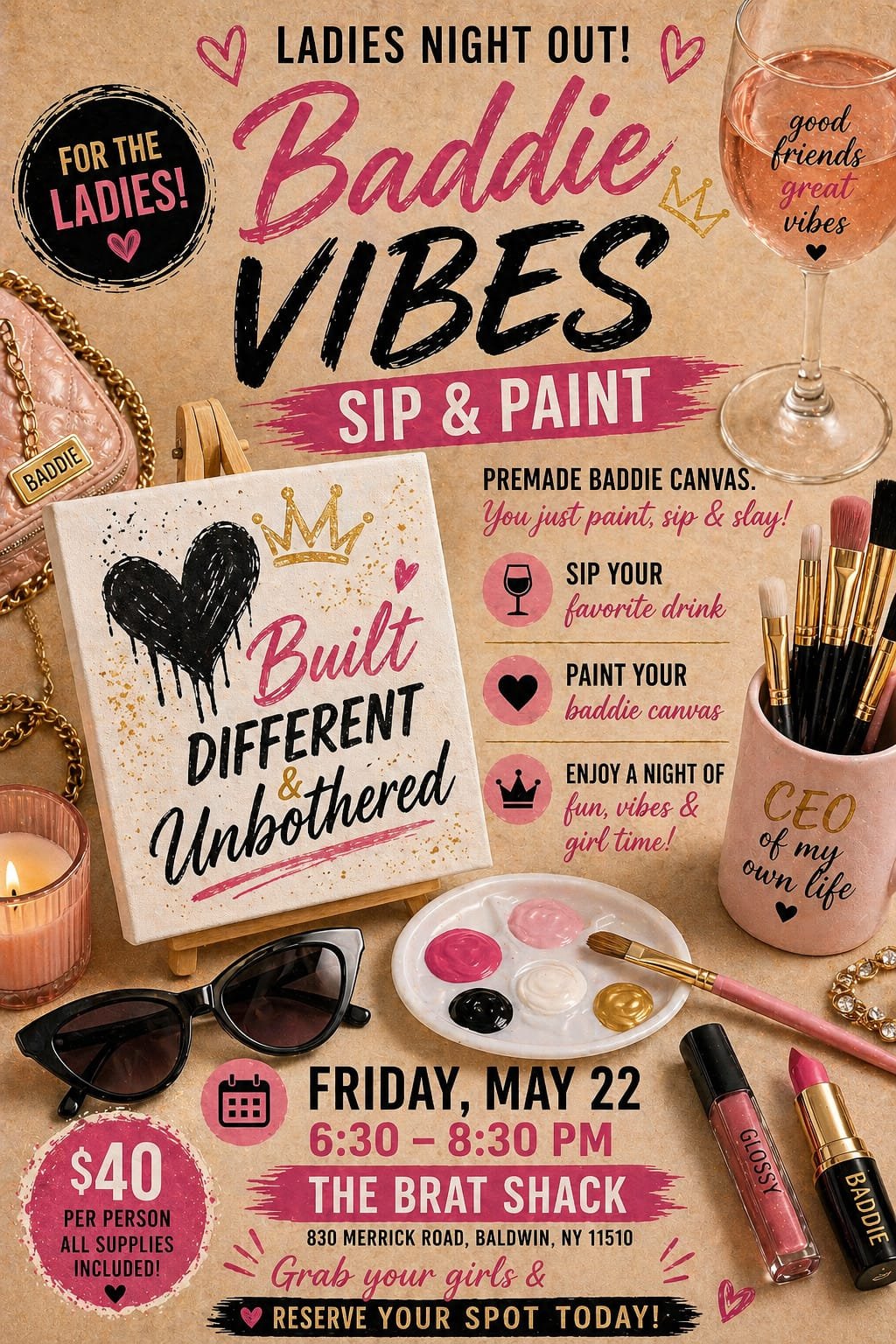 Each guest will receive a premade baddie canvas, so no stress—just paint, customize, and bring your vision to life. Whether you’re coming for the vibes, the creativity, or the girls’ night out, this event is all about fun, confidence, and self-expression.