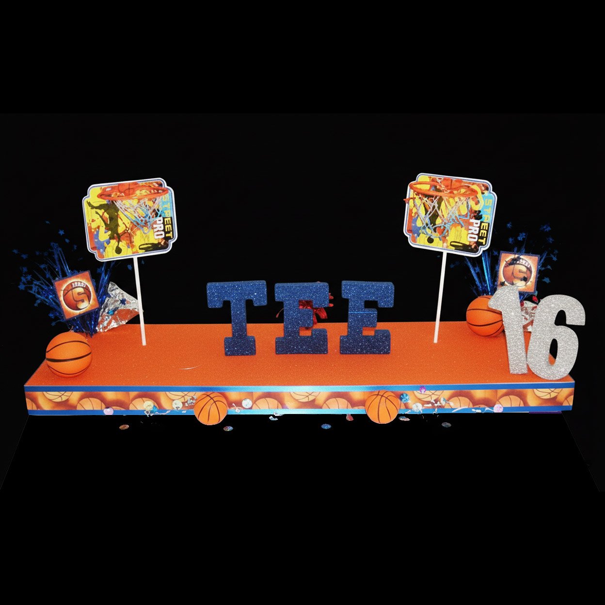 For the love of basketball! Our Basketball Theme one level rectangular glitter base accented with basketball ribbon around the edges, and 2 hoops. We will furnish sixteen 1″ candleholders for your candles (candles not included) if needed. Approximate dimensions: 36″w x 12x 5 “h. Read more below…