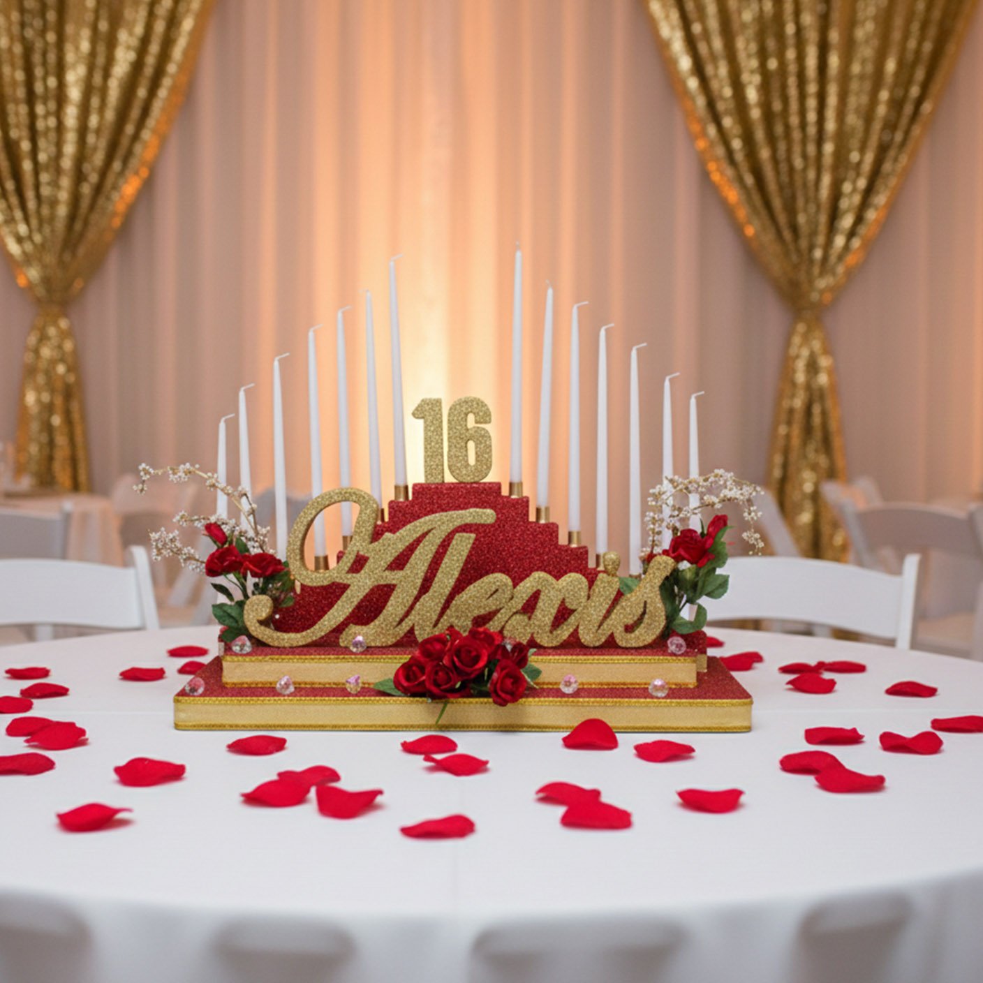 Beauty and the Beast theme candelabra with custom made two rectangular bases. Accented with rich roses and trimmed with ribbon around the edges. We furnish sixteen 1″ candleholders for your candles. Approximate dimensions: 36″w x 12″ x 13 “h. Perfect for Bat Mitzvah, a Sweet 16 or Quinceañera Candle Lighting Ceremony. Dedicate each candle to someone special in your life. You pick the colors for the trim to coordinate it with your theme! SCRIPT LETTERS SHOWN ON SAMPLE.