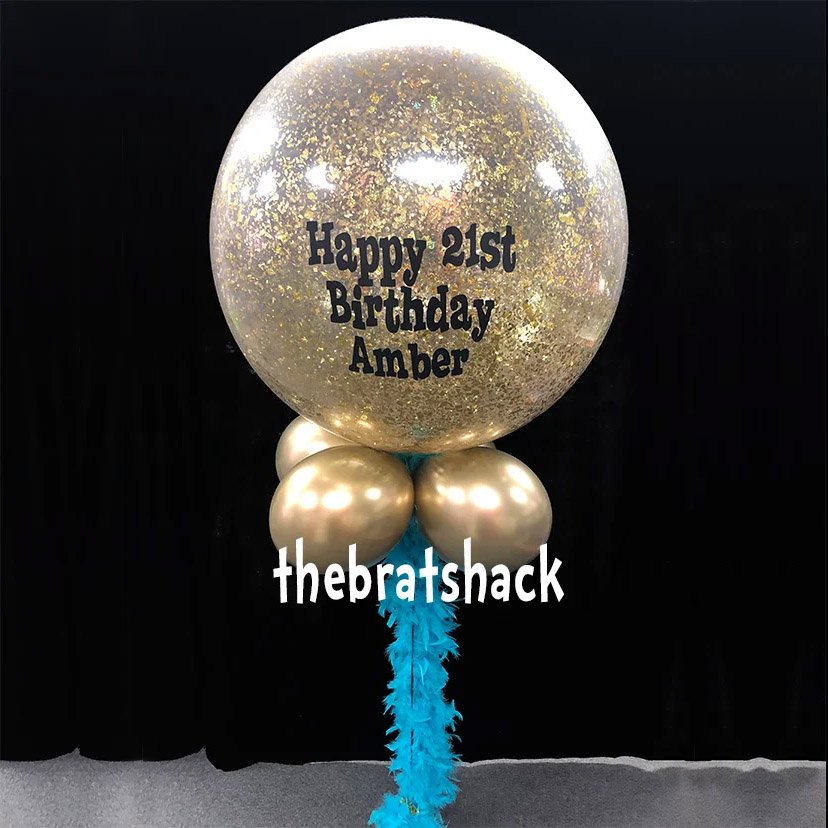 Make a huge statement with this modern Confetti Balloon for an upcoming birthday with name set up. It is perfect for your next event, photo shoot and it would make a perfect wow gift. This set up includes a balloon weight, 1 large clear 36″ balloon at top filled with helium, and a boa personalized with name and celebration. This balloon set up is great for an elegant Christening, Sweet 16, Bridal Showers, Birthday party and any other event your celebrating.