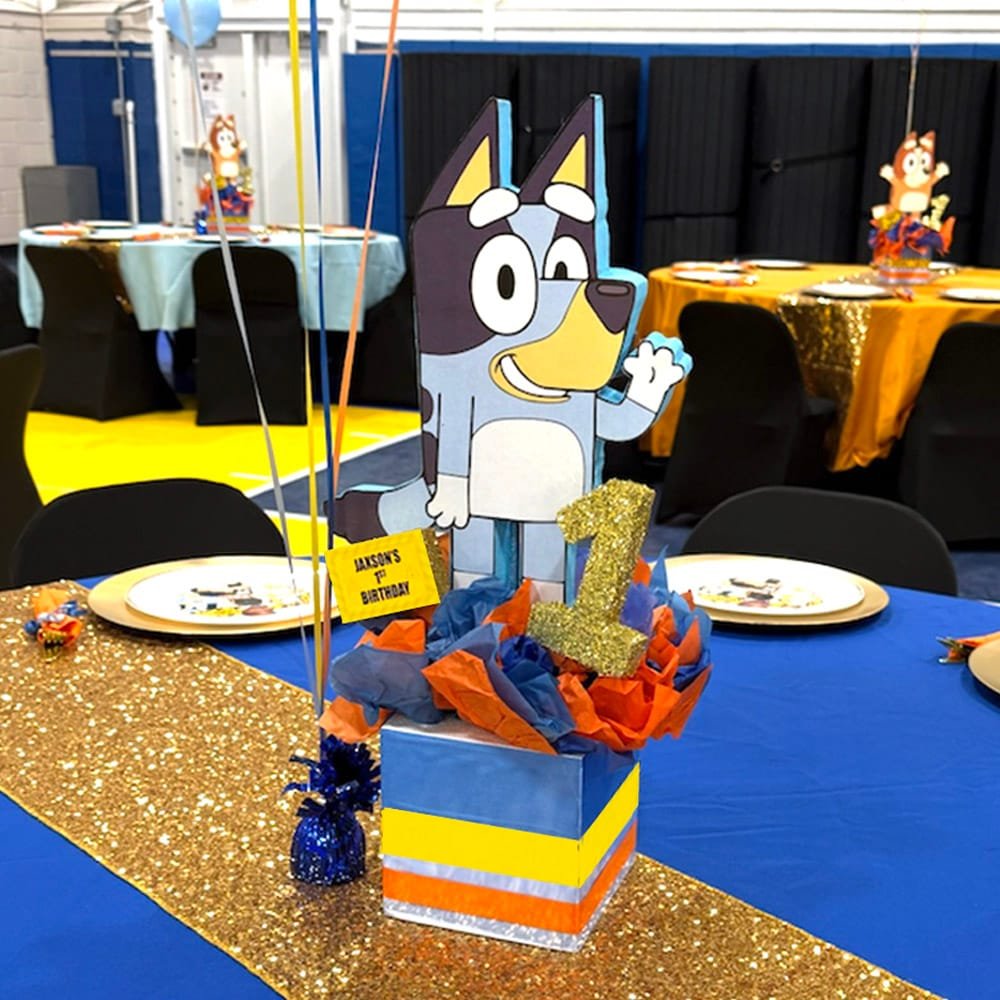Get your paw-some Bluey Character theme centerpiece. Perfect for your child’s next party. Vivid and colorful, made with styrofoam, tissue paper paint, and glitter. This centerpiece will make a great addition to your decoration and perfect to use for table centerpiece. Give your child’s name to personalize this piece especially for you. Approx. 14″ tall sits on a 6×6 square base. Feel free to change colors to coordinate with your theme.