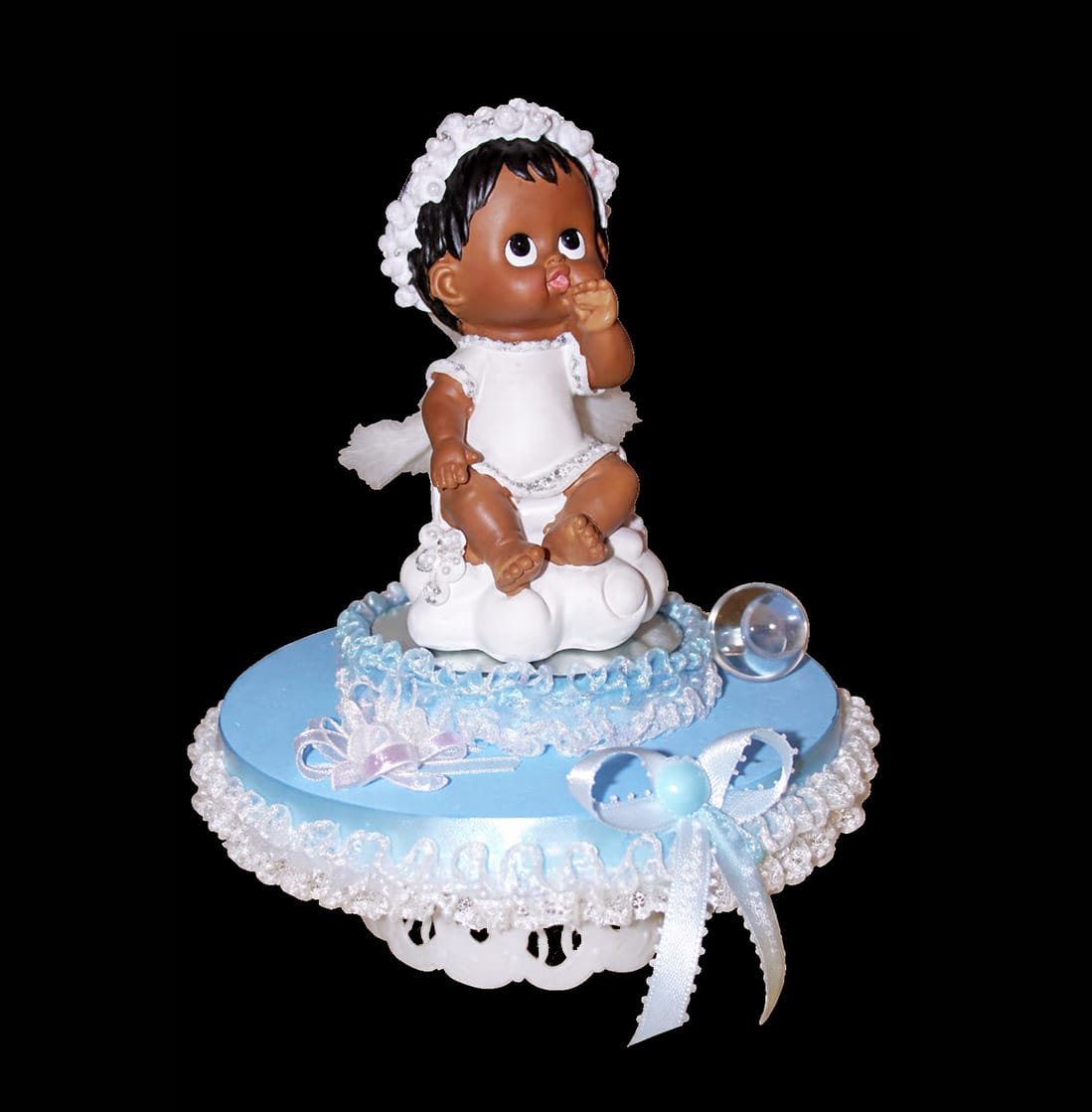 Celebrate a sacred milestone with this Angel Baby Baptism Cake Topper, a charming keepsake designed to add a heartfelt touch to your special occasion. Featuring a beautifully detailed baby figurine seated on a decorative base with soft lace trim, ribbon accents, and delicate embellishments, this piece creates a meaningful focal point for your cake or display table.