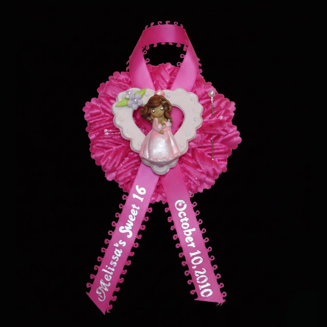 Hand made adorable Little Girl with Dress Capia for your guests! Give every guest at your party a tradtional pin on or capia while the special honoree will wear a beautifully decorated corsage. These can also be used as keepsakes. Specialized for all occasions and all colors. *add your name and date to your ribbon at NO additional cost – while placing your order include the info.* EXAMPLE: Corrine’s 1st Communion May 7, 2020 Great for Sweet 16/15s, Communions and Birthday Parties!