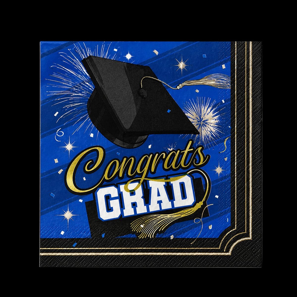 Celebrate your graduate in bold style with these eye-catching “Congrats Grad” Blue napkins. Featuring a vibrant blue background with black and gold accents, fireworks, and a classic graduation cap design, these napkins add energy and excitement to any graduation party setup.