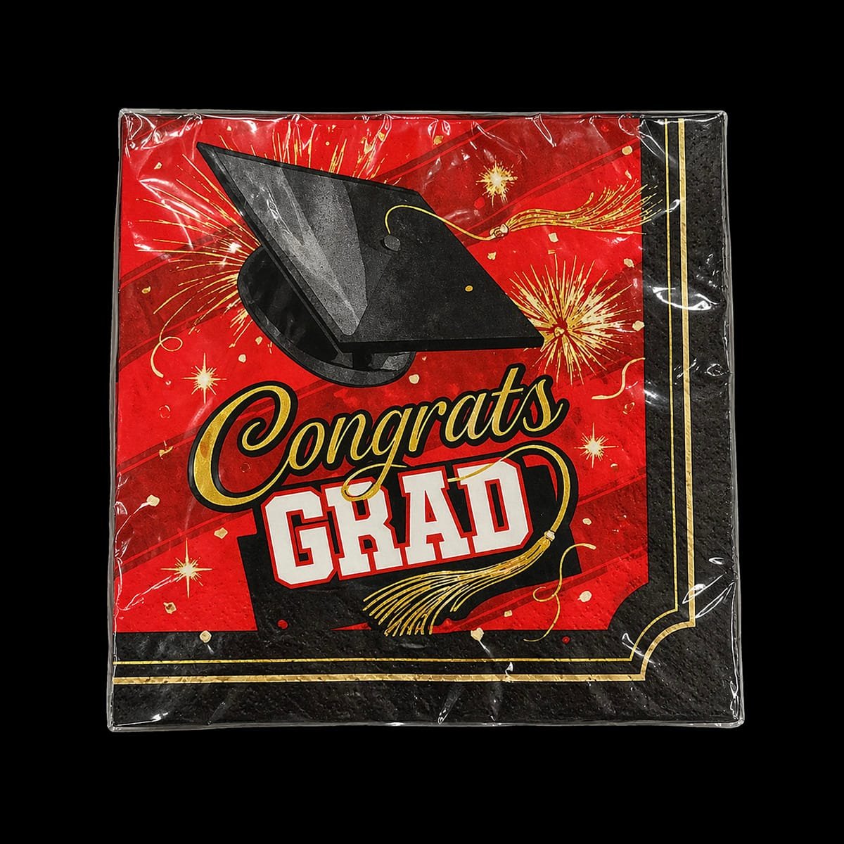 Celebrate your graduate in bold style with these eye-catching “Congrats Grad” red napkins. Featuring a vibrant red background with black and gold accents, fireworks, and a classic graduation cap design, these napkins add energy and excitement to any graduation party setup.