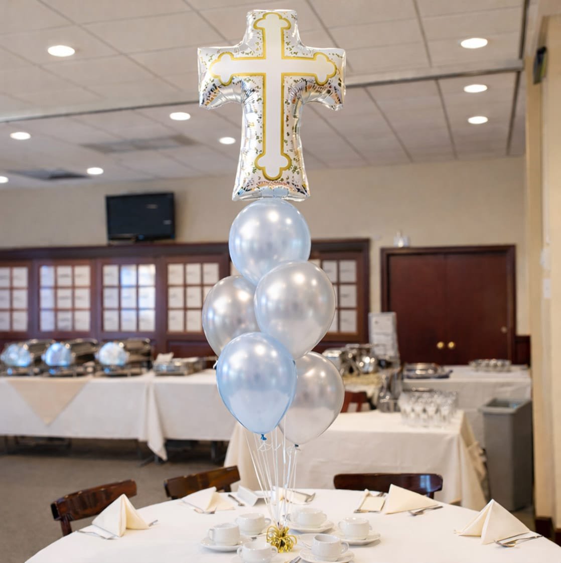 Cross Balloon table Centerpiece Set Up is perfect for your next religious event. As Communion season approach, precious Baptisms and sweet Christenings are always happening. This set up is great to put on your entry table or at each table. This set up includes a balloon weight, 1 large 28″ Cross Mylar balloon and (5) 12″ inch balloons. Just choose your colors to get started.