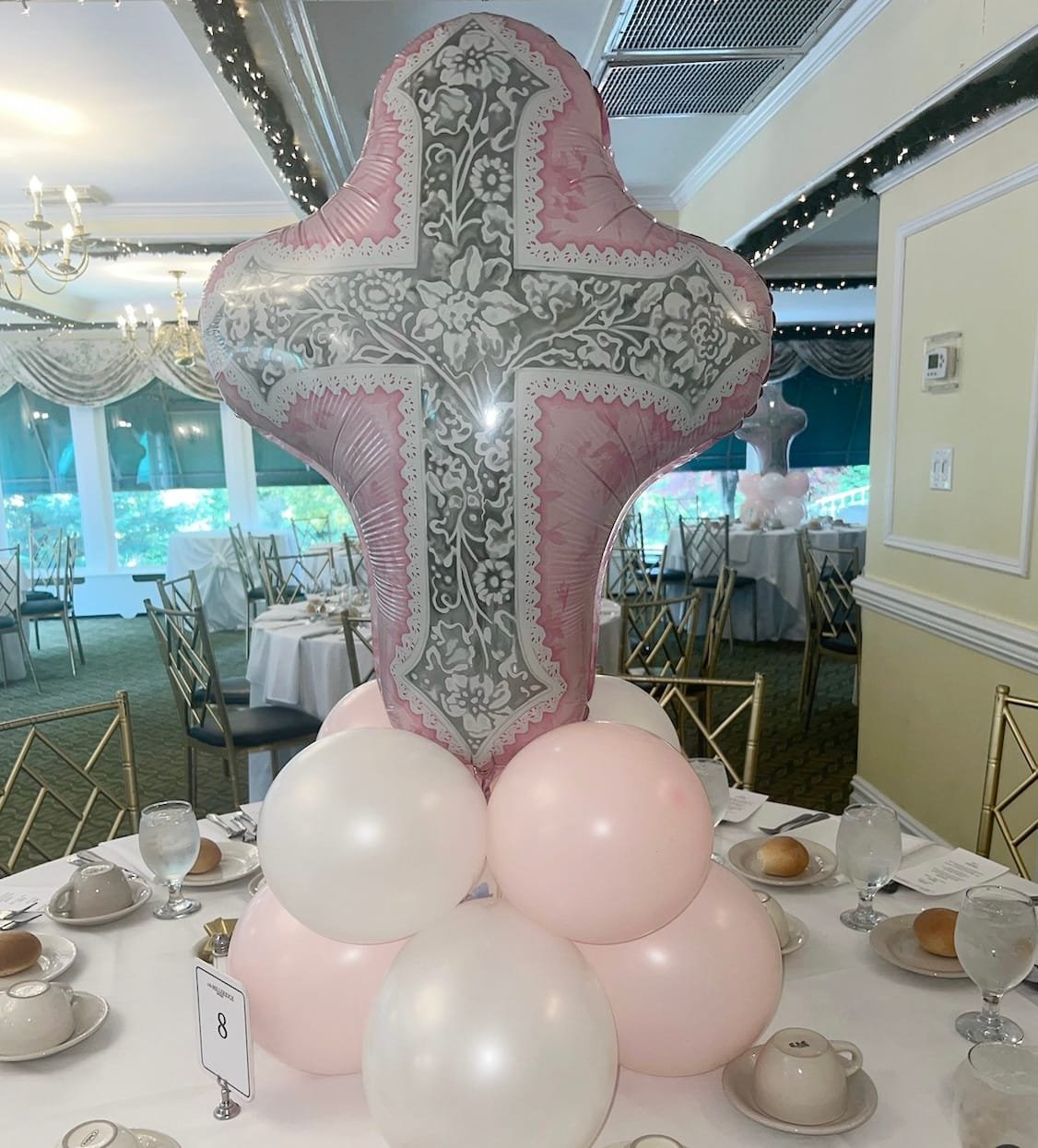Cross Balloon table topper Centerpiece Set Up is perfect for your next religious event. As Communion season approach, precious Baptisms and Christenings are always happening. This set up is great to put on your entry table or at each table. This set up includes a balloon weight, 1 large Cross Mylar balloon and 2 layers of 11″ inch balloons at bottom.