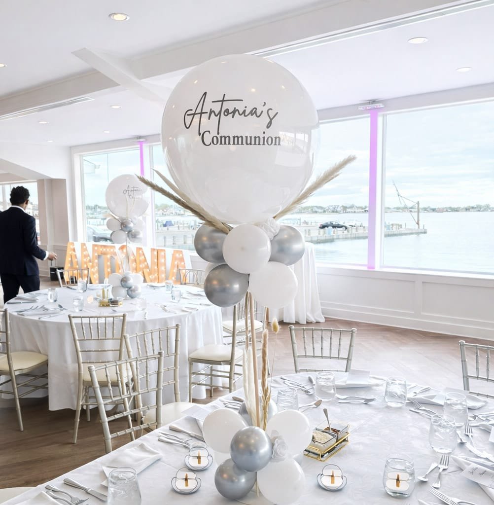 Create a beautiful and memorable celebration with our elegant Custom Communion Balloon Centerpiece. Designed to complement sophisticated event décor, this arrangement features a large personalized balloon accented with coordinating latex balloons and soft neutral tones that blend seamlessly into any venue.