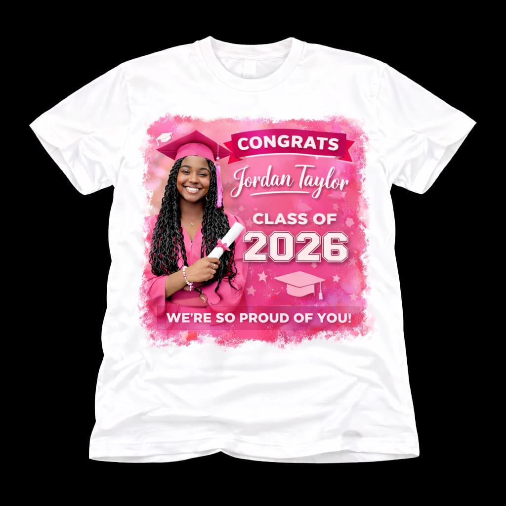 Celebrate your graduate in bold, stylish fashion with our Custom Graduation Photo T-Shirt – Pink Grunge Edition. This eye-catching design features a vibrant pink backdrop with trendy grunge edges, personalized with your graduate’s photo, name, and class year for a one-of-a-kind look.