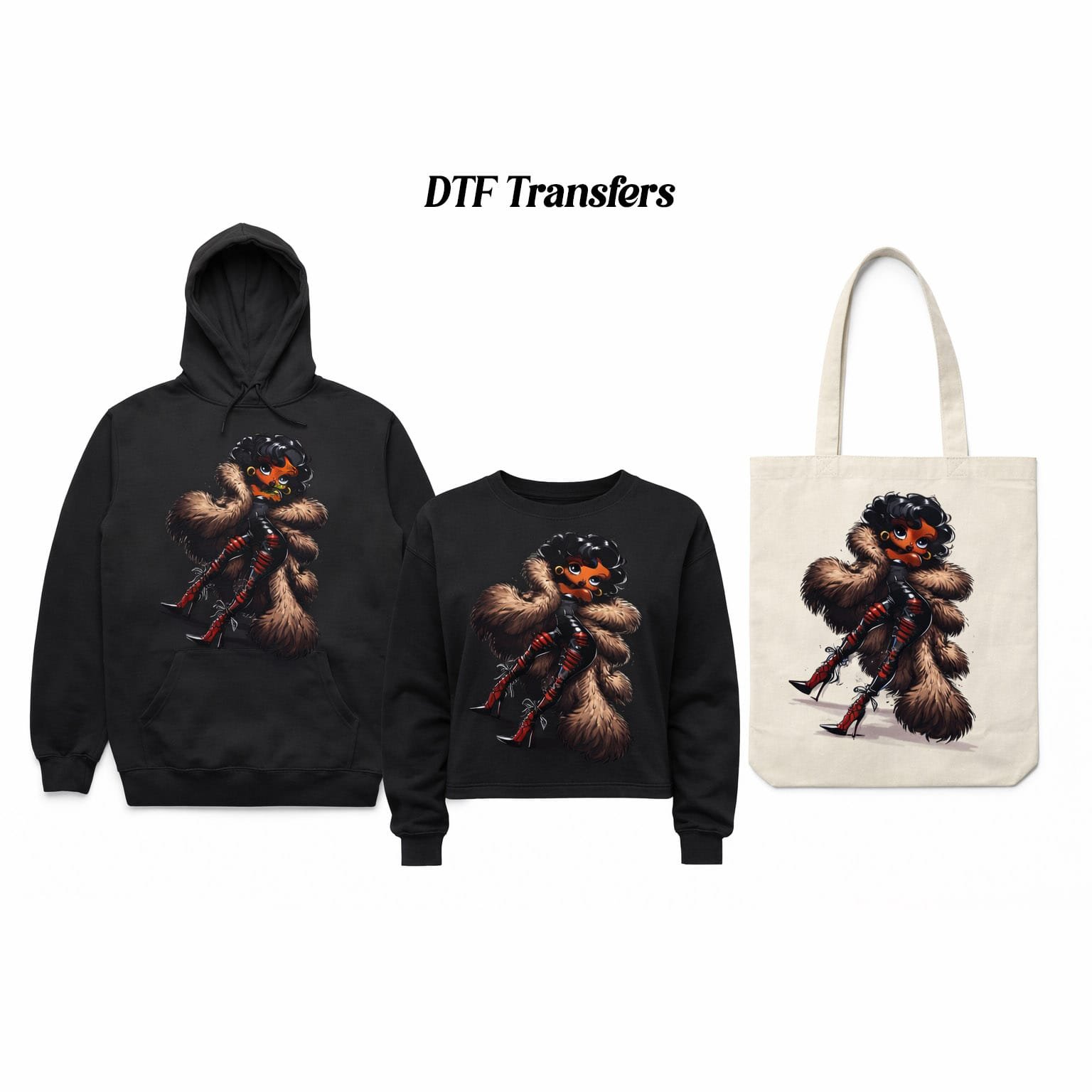Make a statement with this fierce, fashion-forward DTF transfer featuring a confident illustrated diva dripping in attitude and luxury. This design showcases a stylish character with voluminous curls, dramatic lashes, gold hoops, a plush fur coat, and striking lace-up heels—serving unapologetic glam and boss energy.