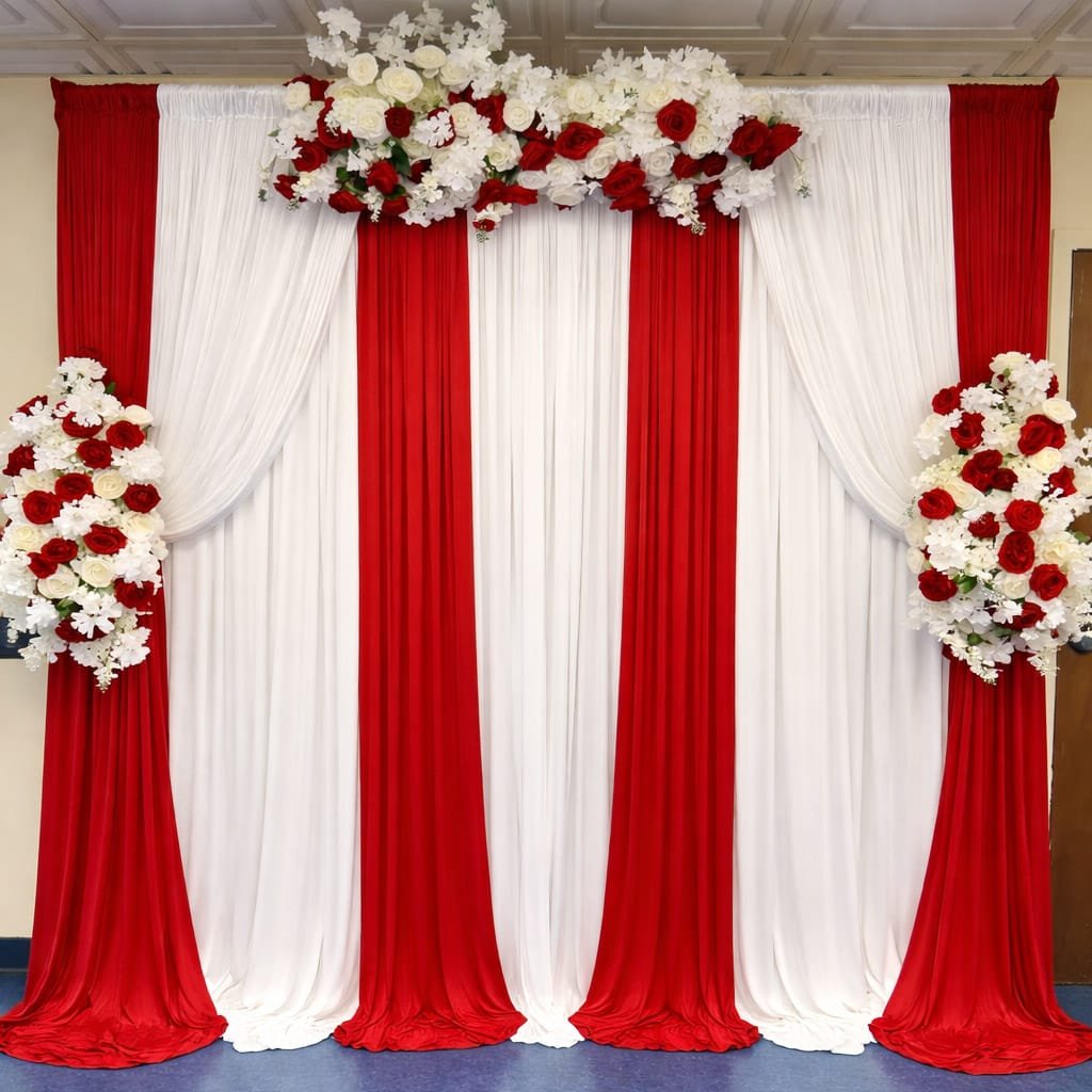 Create a stunning focal point for your event with this luxurious draped backdrop, designed to bring elegance and drama to any celebration. Featuring perfectly layered, floor-length fabric panels in rich red and crisp white, this setup delivers a bold yet sophisticated look that enhances photos and elevates your entire space.
