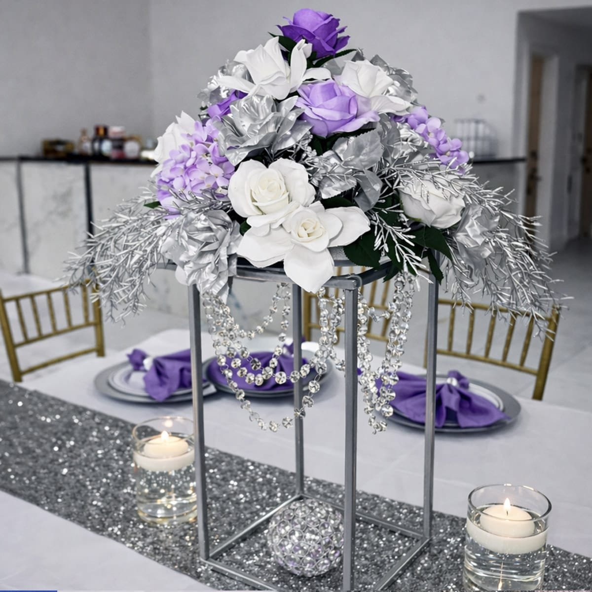 • Includes square crystal riser(available in gold or silver), custom color flower arrangement, 2 floating candles and 1 small crystal votive (runner not included unless rented separately)