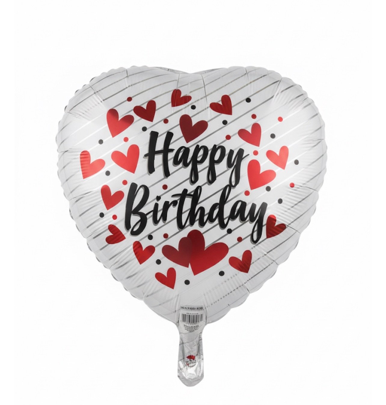 Celebrate in style with this charming 18-inch Heart-Shaped “Happy Birthday” Mylar Balloon. Designed with a bright white background accented by playful diagonal stripes, it features bold black “Happy Birthday” lettering surrounded by red and black hearts, creating a festive and loving vibe.
