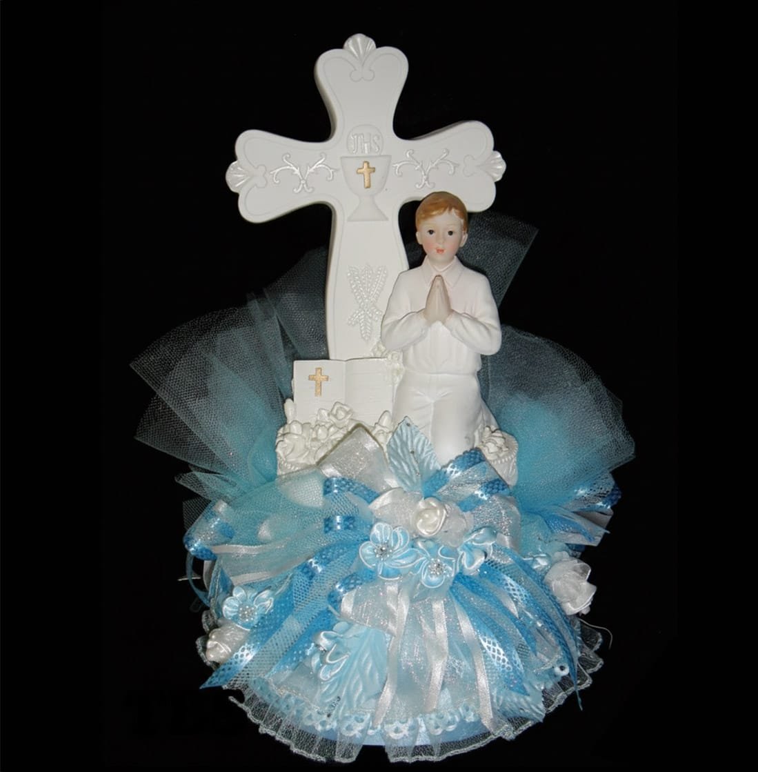 Commemorate a sacred milestone with this elegant First Holy Communion Boy Cross Keepsake. Featuring a beautifully detailed figurine of a praying boy positioned in front of a decorative cross, this piece is accented with layered tulle, ribbon, and floral embellishments in soft blue and white tones.