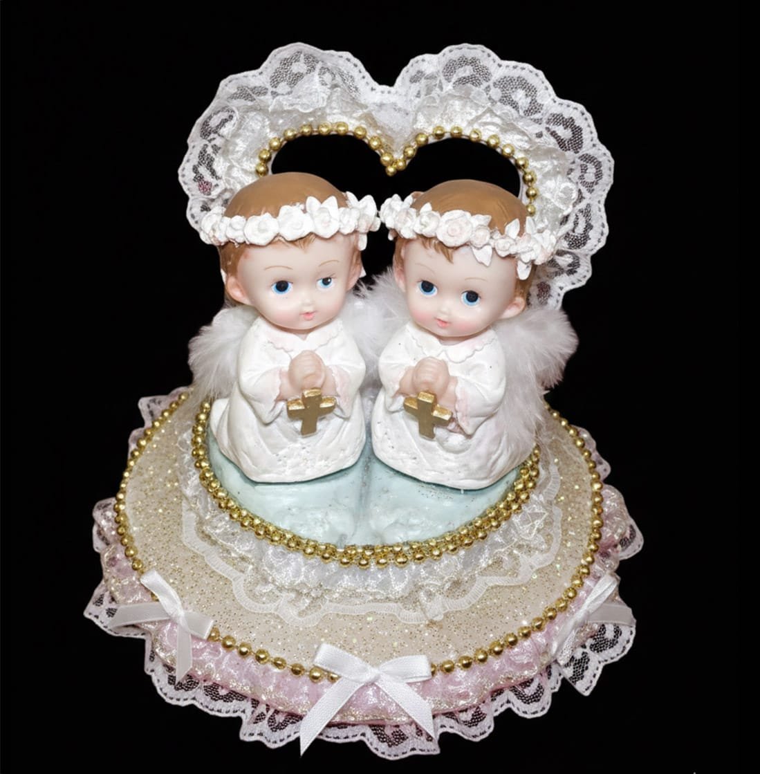 Celebrate a precious blessing with this beautifully crafted Twin Angel Baptism Keepsake Display. Featuring two detailed praying angel figurines holding crosses, this piece is designed with delicate lace, soft pastel accents, and elegant gold trim to create a meaningful and heartwarming presentation.
