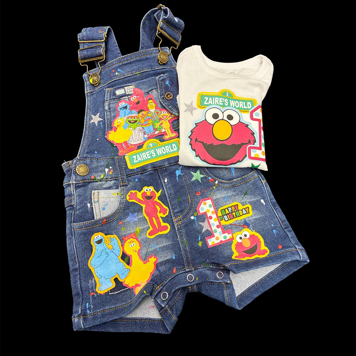 This adorable set includes denim overalls and a t-shirt featuring your child’s favorite character, their name, age and fun paint-splatter details — perfect for parties and photo shoots.
