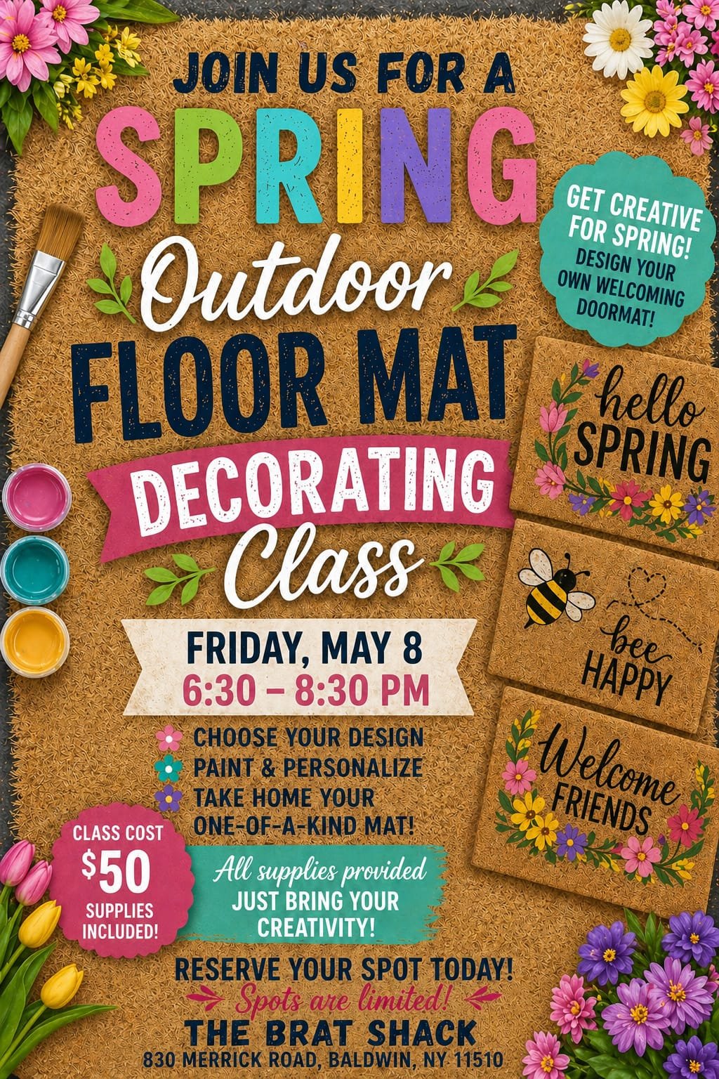 Get creative this spring and design your own custom outdoor floor mat! Join us for a fun, hands-on class where you’ll paint and personalize a beautiful welcome mat perfect for your home or as a unique gift.