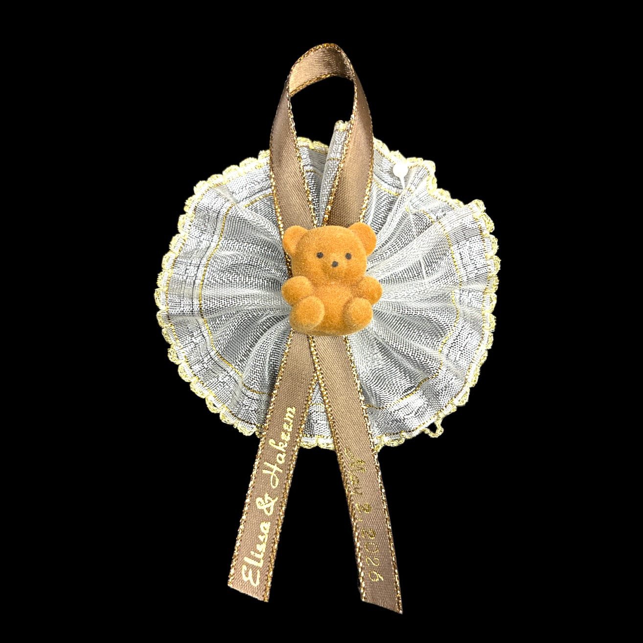 Elegant and adorable teddy bear baby shower capias for your guests! Give every guest at your party a tradtional pin on or capia while the special honoree will wear a beautifully decorated corsage. These can also be used as keepsakes. This design features a flocked teddy bear with brown assorted colors and a organza fan back.