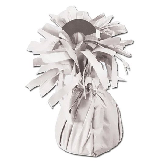 WHITE BALLOON WEIGHT. Anchor your party balloons with our frilly topped Balloon Weight! Capable of securing up to 8 latex or 8 foil helium filled balloons, this balloon weight makes a great party table centerpiece for birthdays and more! Our Foil Balloon Weight stands 4in tall and weighs approximately 6oz.