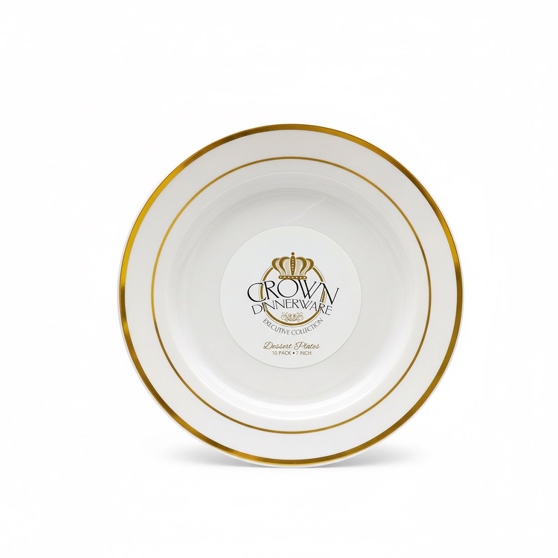 Serve your desserts in true luxury with our White & Gold Rim Dessert Plates from the Crown Dinnerware Executive Collection. Designed with a crisp white center and a sleek metallic gold rim, these 7-inch premium disposable platesbring timeless elegance to any table setting.