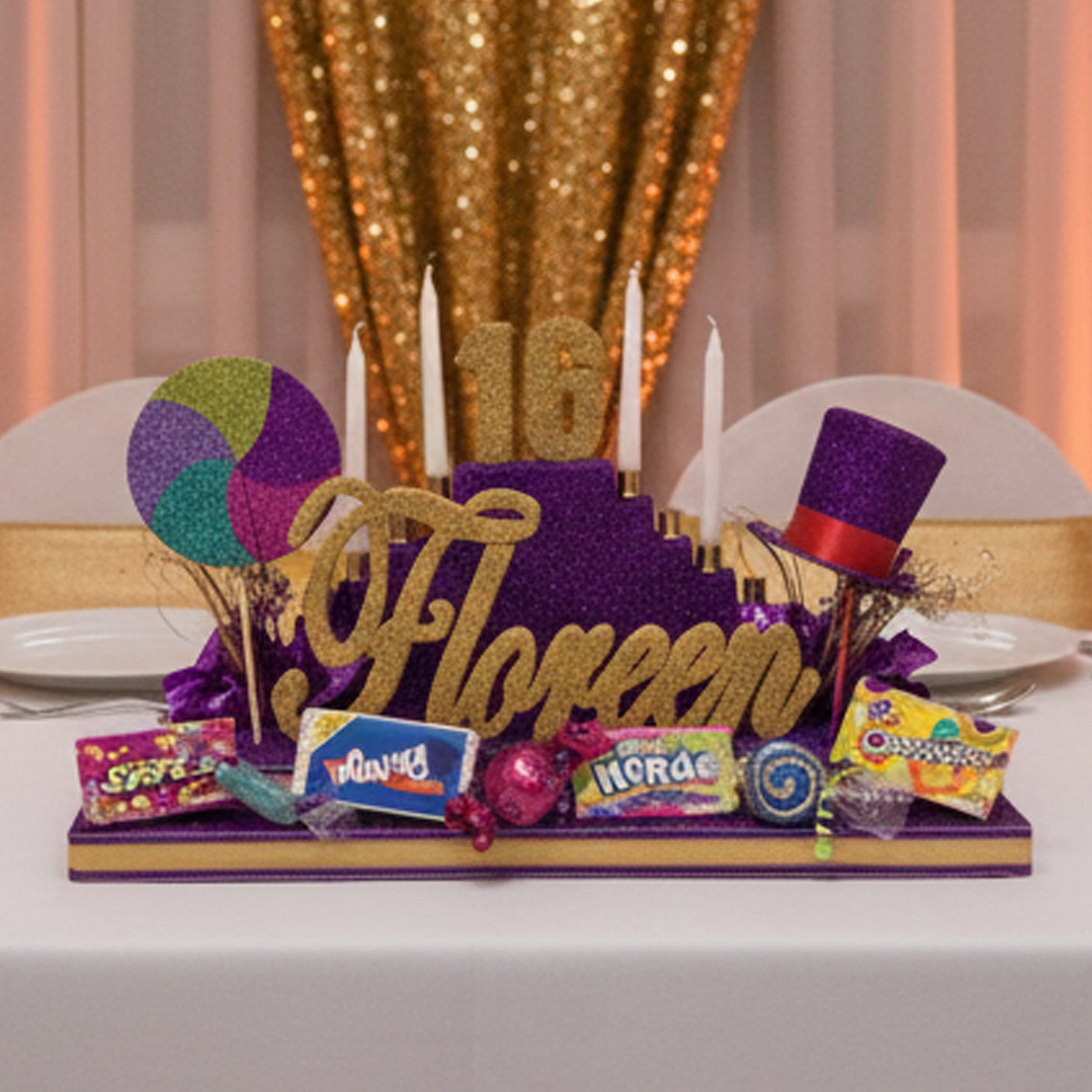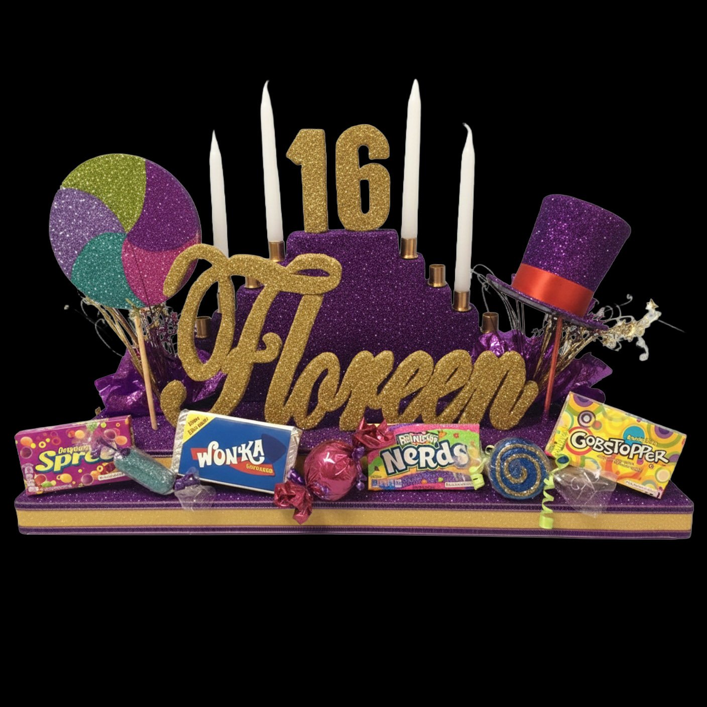 Are you Planning a Candy Theme Sweet 16? Well don’t forget your candelabra for the lighting ceremony. The Brat Shack makes custom candelabras for your theme in your color. For the Chocolate Factory theme we use vibrant glitter colors and Wonka theme candy boxes. It is accented with a Wonka Hat, a 12″ inch Whirly Pop made of styrofoam. This candelabra with Your Name is custom made on a two-tiered rectangular base and also has an elevated stair step in the back that hold the candles. We furnish sixteen 1″ candleholders for your candles (candles not included). Approximate dimensions: 36″w x 12 x 12″h.